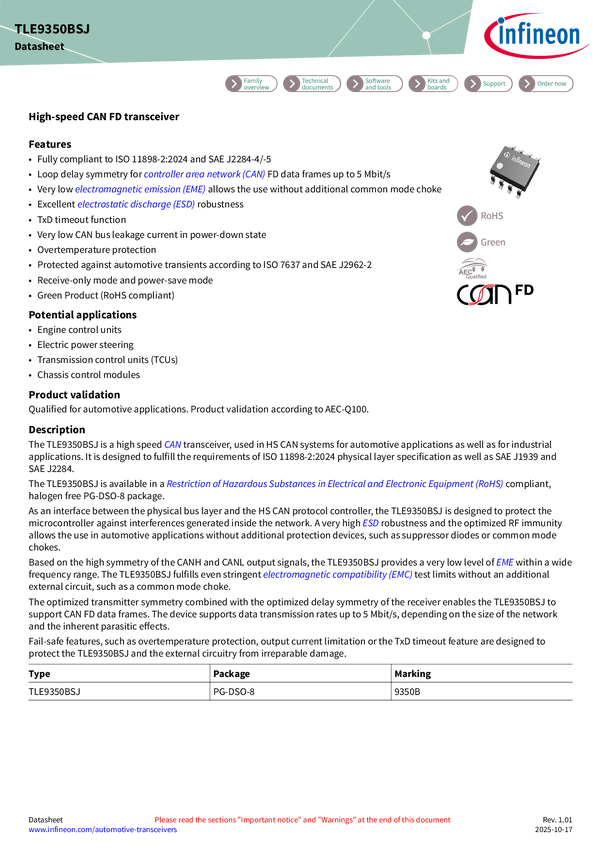 The TLE9350BXLE High Speed CAN FD transceiver for use in HS CAN networks for automotive and for industrial applications The TLE9350BXLE is a high-speed CAN transceiver, used in HS CAN systems for automotive applications as well as for industrial applications. It is designed to fulfill the requirements of ISO 11898-2:2024 physical layer specification as well as SAE J1939 and SAE J2284. The TLE9350BXLE is available in a RoHS compliant, halogen free PG-TSON-8