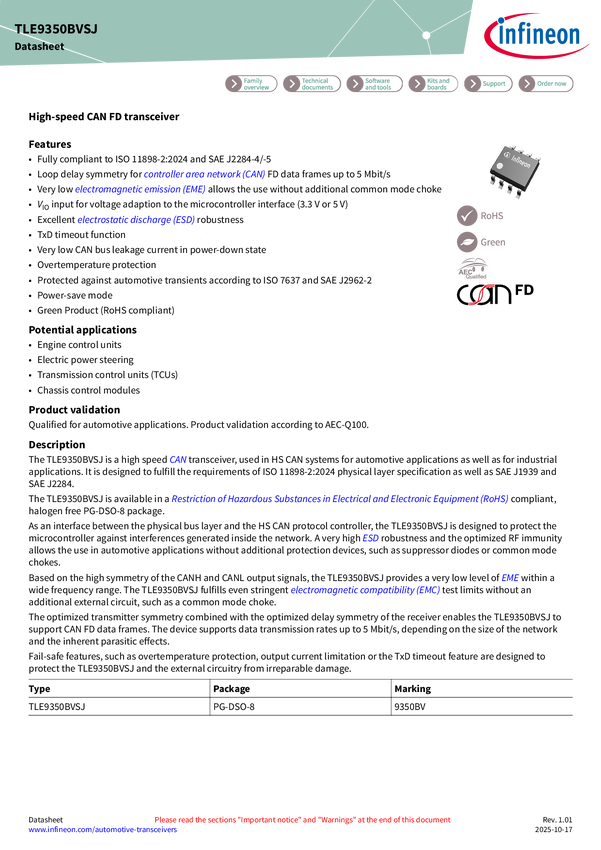 The TLE9350BVSJ High Speed CAN FD transceiver for use in HS CAN networks for automotive and also for industrial applications The TLE9350BVSJ is a high speed CAN transceiver, used in HS CAN systems for automotive applications as well as for industrial applications. It is designed to fulfill the requirements of ISO 11898-2:2016 physical layer specification as well as SAE J1939 and SAE J2284. The TLE9350BVSJ is available in a RoHS compliant, halogen free PG-DSO-8 package.