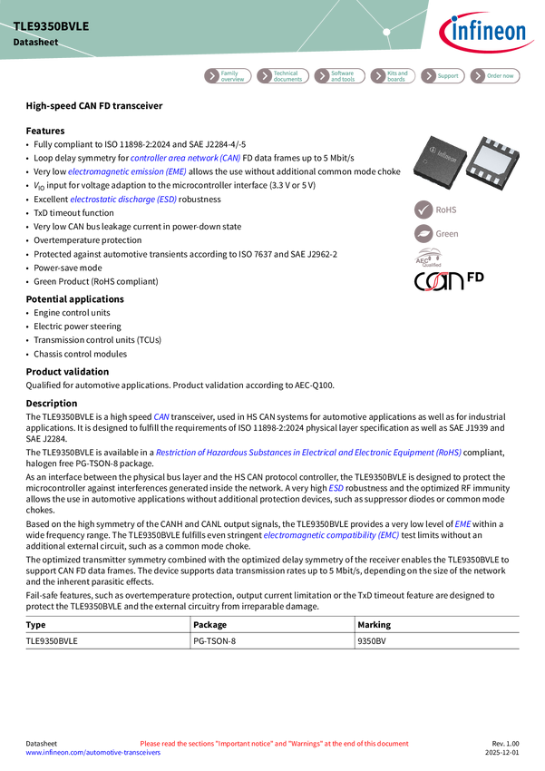The TLE9350BVLE High Speed CAN FD transceiver for use in HS CAN networks for automotive and for industrial applications The TLE9350BVLE is a high-speed CAN transceiver, used in HS CAN systems for automotive applications as well as for industrial applications. It is designed to fulfill the requirements of ISO 11898-2:2024 physical layer specification as well as SAE J1939 and SAE J2284. The TLE9350BVLE is available in a RoHS compliant, halogen free PG-TSON-8 package.