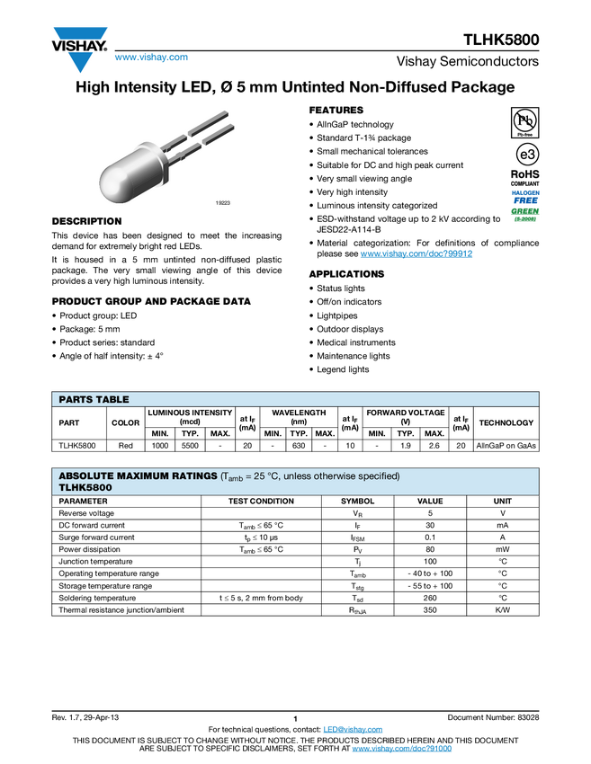 High Intensity LED, Ø 5 mm Untinted Non-Diffused Package
