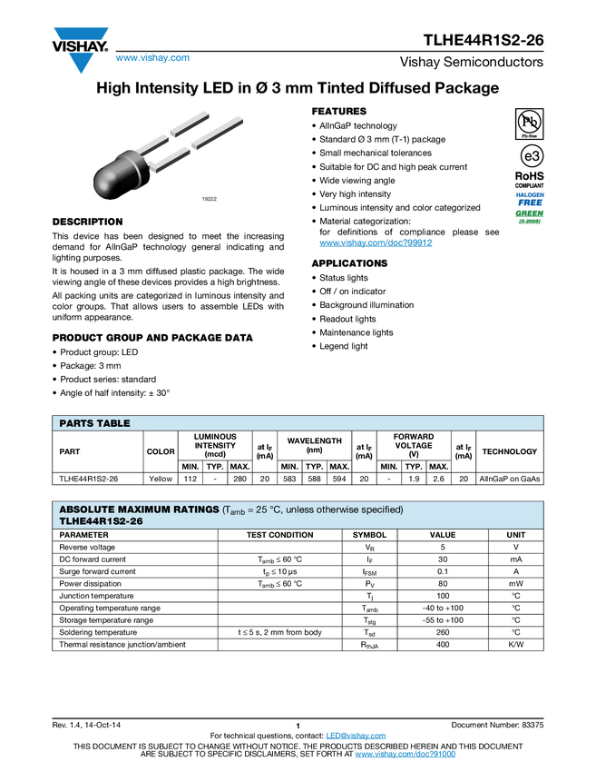 High Efficiency LED, Ø 3 mm Tinted Total Diffused Package