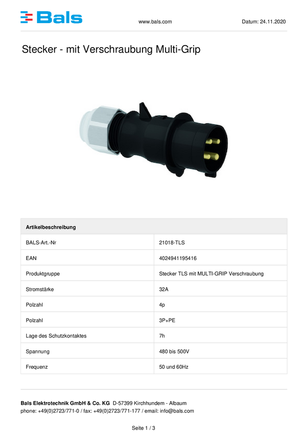 Złacze męskie CEE Bals Elektrotechnik 21018-TLS 32.0 A 500 V