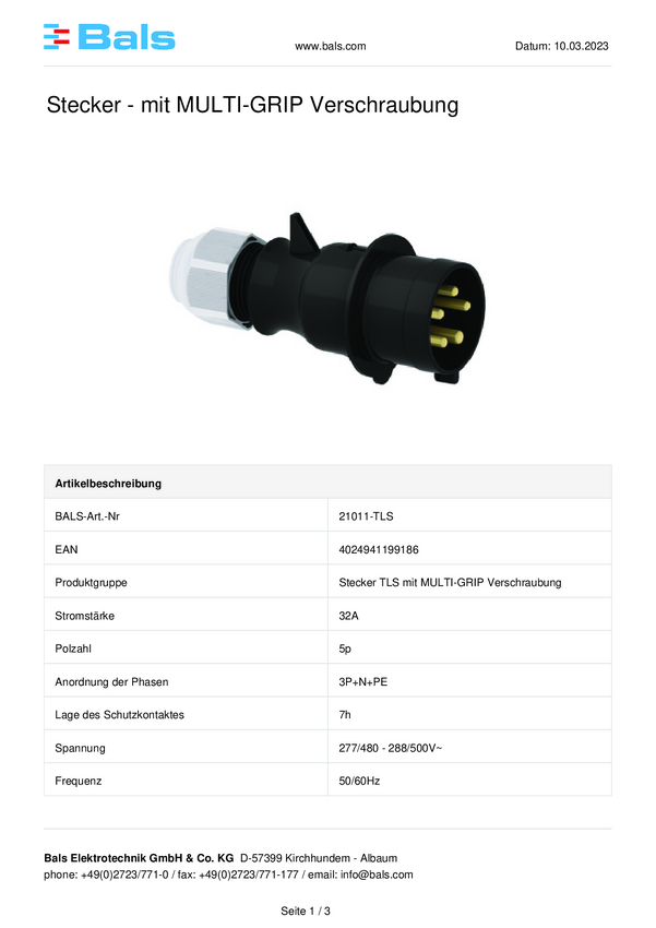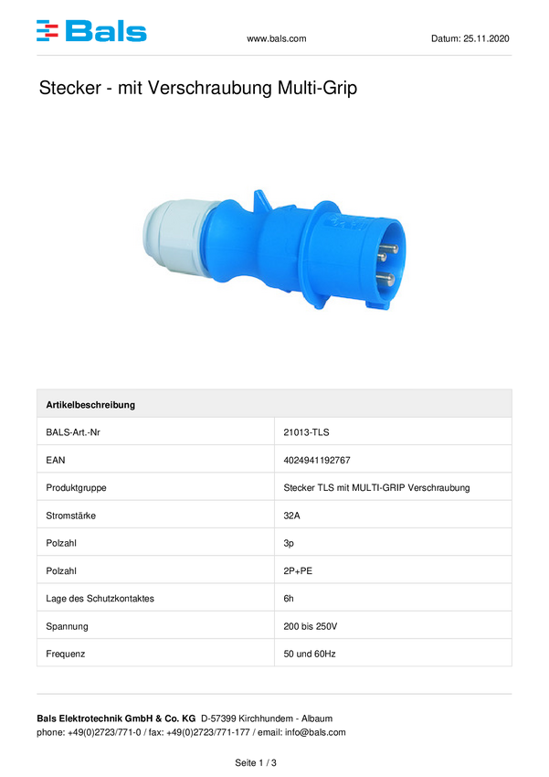 Złacze męskie CEE Bals Elektrotechnik 21013-TLS 32.0 A 230 V