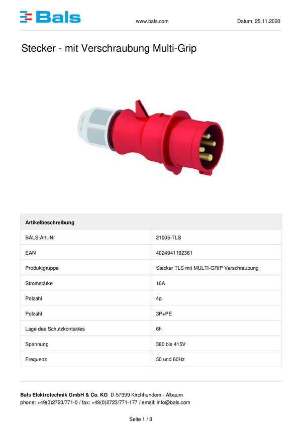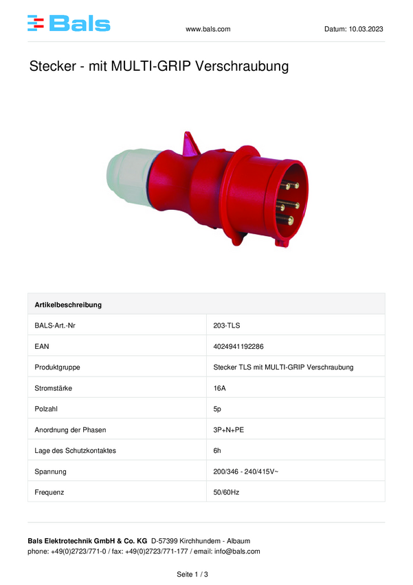 Złacze męskie CEE Bals Elektrotechnik 203-TLS 16.0 A 400 V