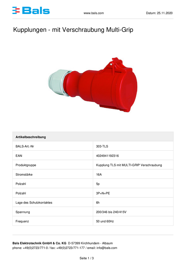 Łacznik CEE Bals Elektrotechnik 303-TLS 16.0 A 400 V