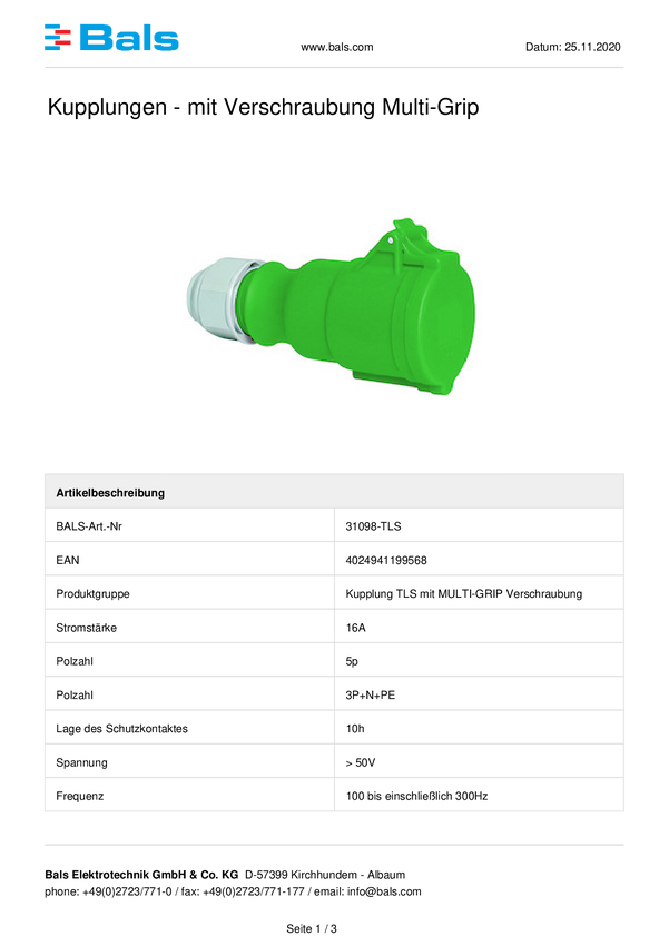 Łacznik CEE Bals Elektrotechnik 31098-TLS 16.0 A 500 V