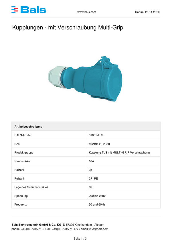 Łacznik CEE Bals Elektrotechnik 31001-TLS 16.0 A 230 V