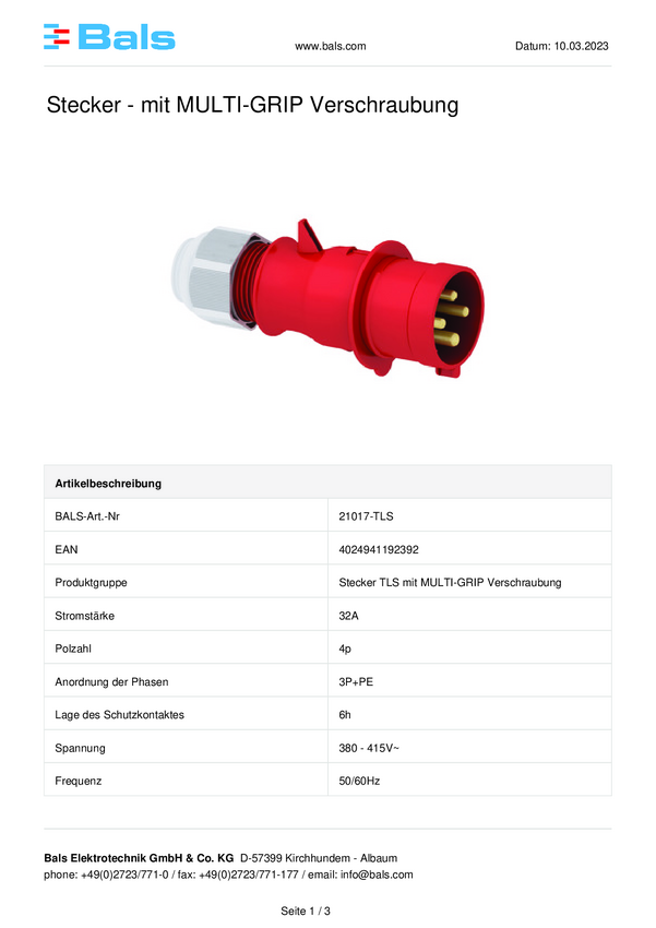Złacze męskie CEE Bals Elektrotechnik 21017-TLS 32.0 A 400 V