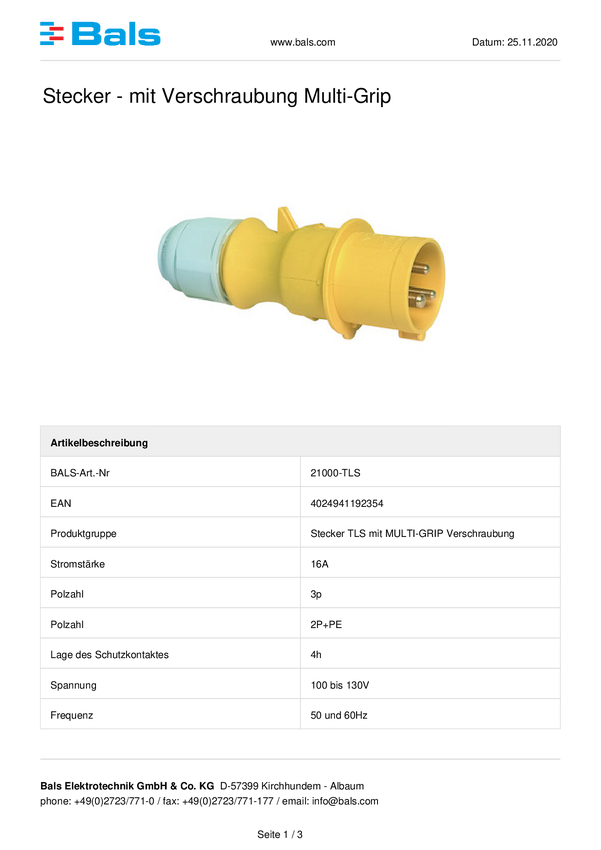 Złacze męskie CEE Bals Elektrotechnik 21000-TLS 16.0 A 110 V
