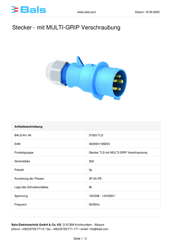 Złacze męskie CEE Bals Elektrotechnik 21022-TLS 32.0 A 230 V