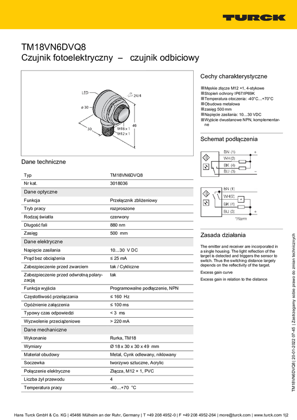 Czujnik dyfuzyjny Turck TM18VP6DVQ8 3018027 1 szt.