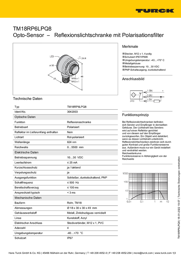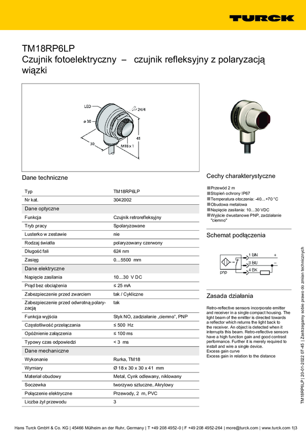 Fotokomórka odbiciowa Turck TM18RP6LP 3042002 przełączanie w ciemności 1 szt.