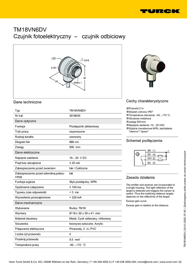 Czujnik dyfuzyjny Turck TM18VN6DV 3018035 1 szt.