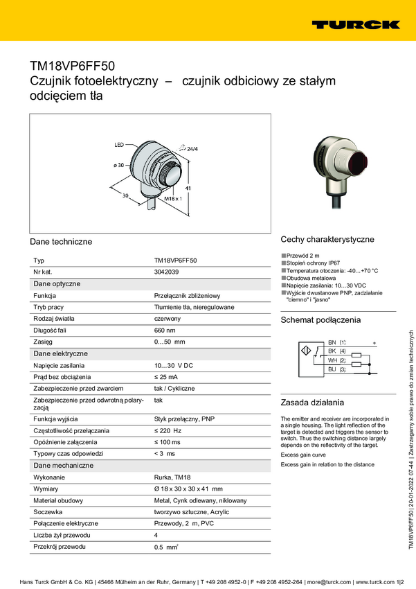 Czujnik dyfuzyjny Turck TM18VP6FF50 3042039 1 szt.
