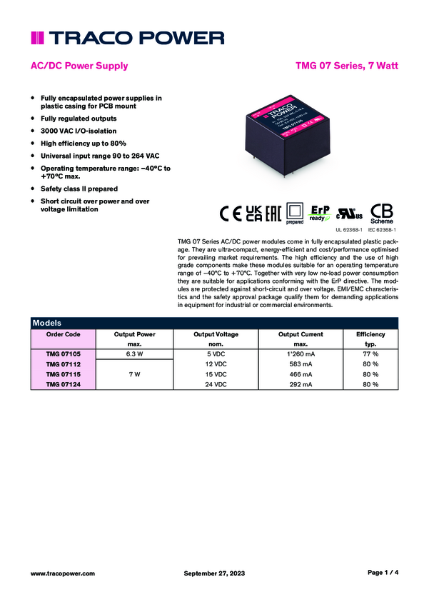 TracoPower TMG 07105 Zasilacz AC/DC 5 V/DC 1.26 A 6.3 W