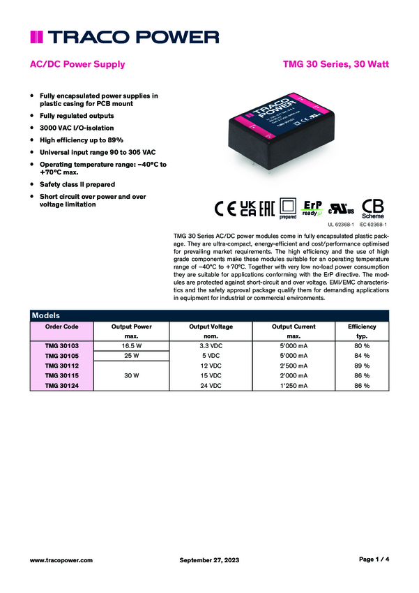 Zasilacz AC/DC TracoPower TMG 30103 3.3 V/DC 5 A 16.5 W