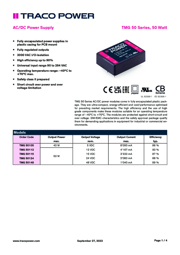 Zasilacz AC/DC TracoPower TMG 50105 5 V/DC 8 A 40 W