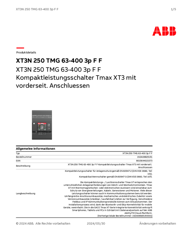 Wyłącznik zasilania ABB XT3N 250 TMG 63-40 Zakres ustawienia (Prąd): 400 A (max) Maksymalne napięcie przełączania: 220 V