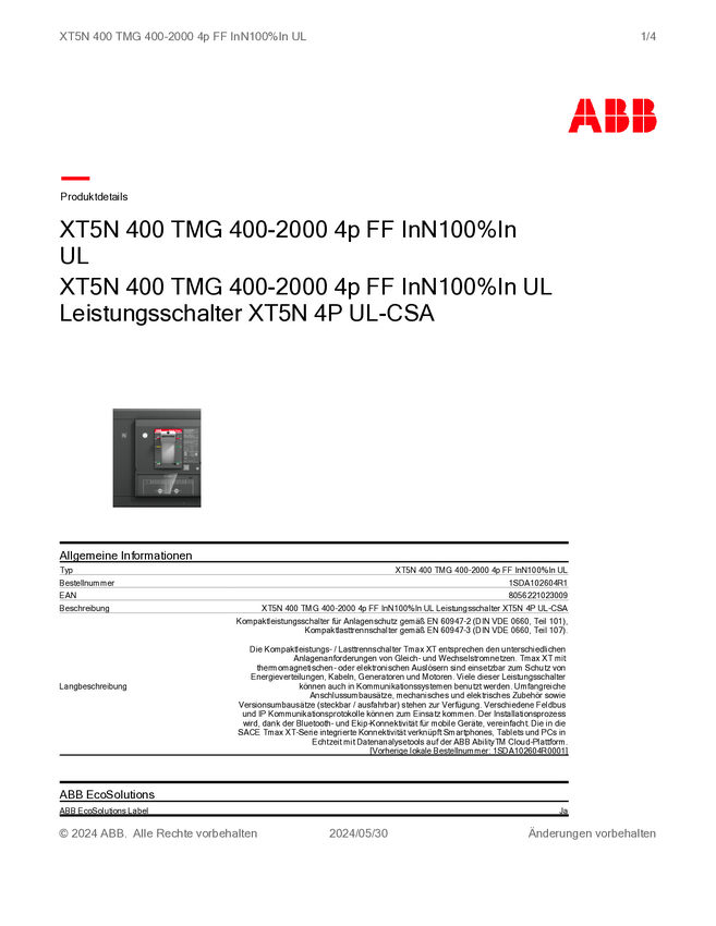 Wyłącznik zasilania ABB XT5N 400 TMG 400-2 Zakres ustawienia (Prąd): 560 - 2000 A Maksymalne napięcie przełączania: 240