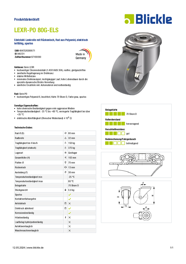 Blickle 945721 LEXR-PO 80G-ELS Rolka skrętna ze stali nierdzewnej Średnica koła: 80 mm Maksymalne obciążenie: 150 kg 1 s