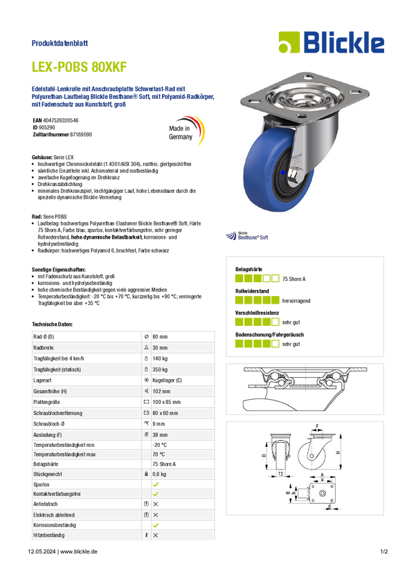 Blickle 905290 LEX-POBS 80XKF Rolka skrętna ze stali nierdzewnej Średnica koła: 80 mm Maksymalne obciążenie: 140 kg 1 sz