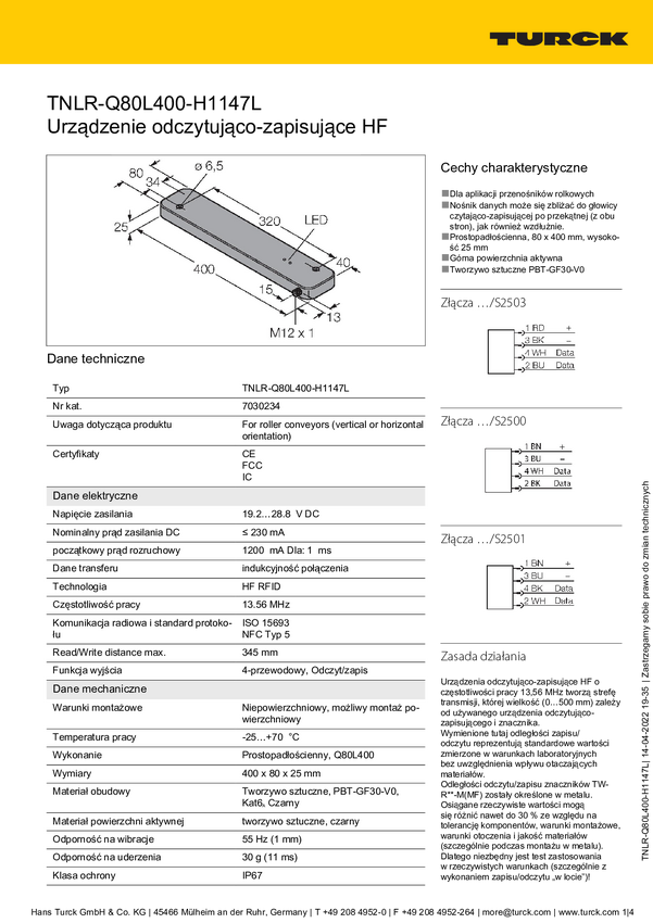 Głowica do odczytu i zapisu Turck TNLR-Q80L400-H1147L 7030234, 1 szt.