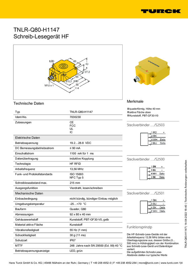 Głowica do odczytu i zapisu Turck TNLR-Q80-H1147 7030230, 1 szt.