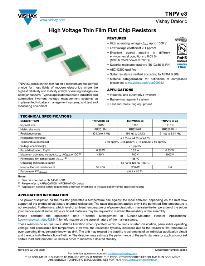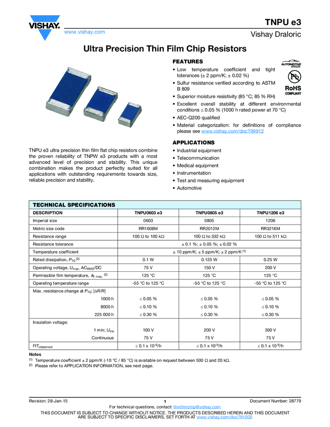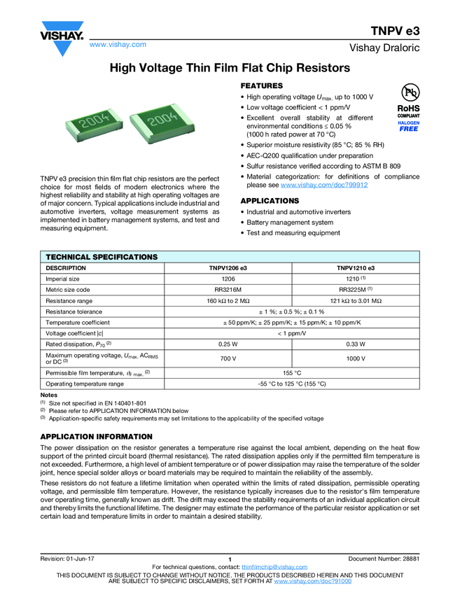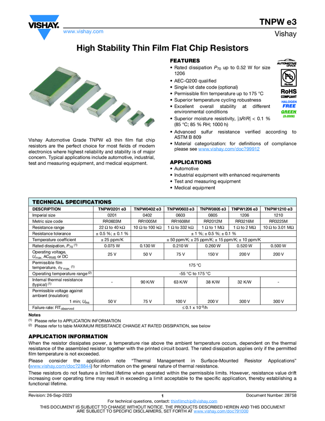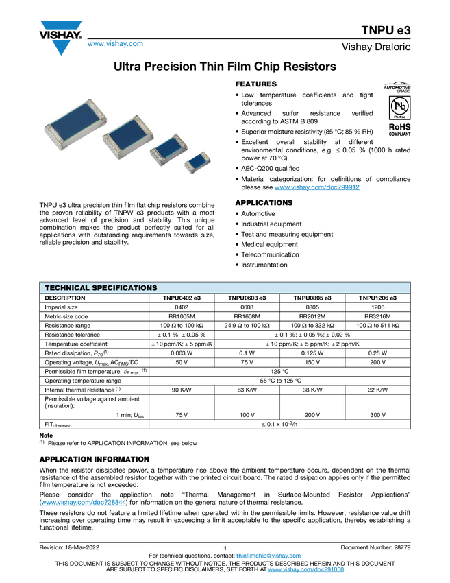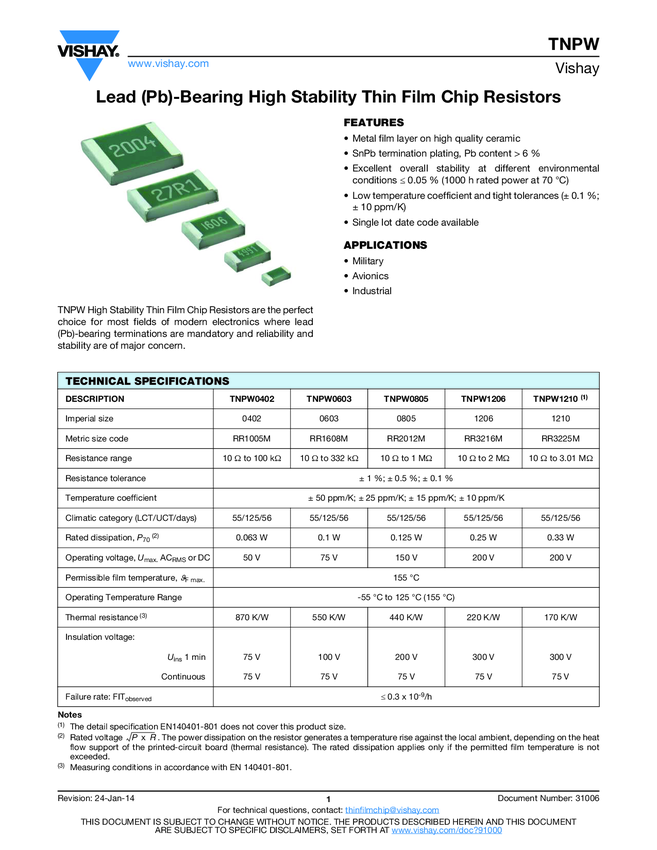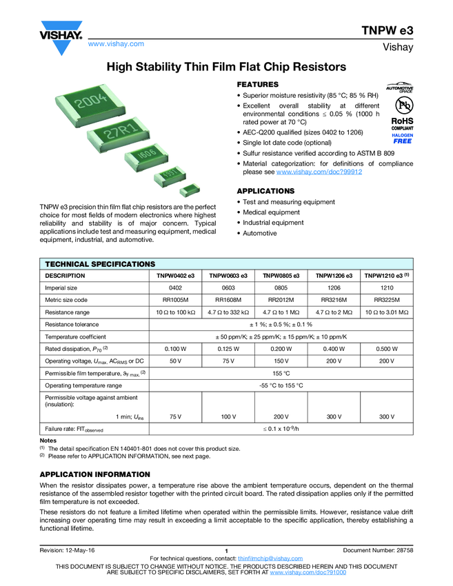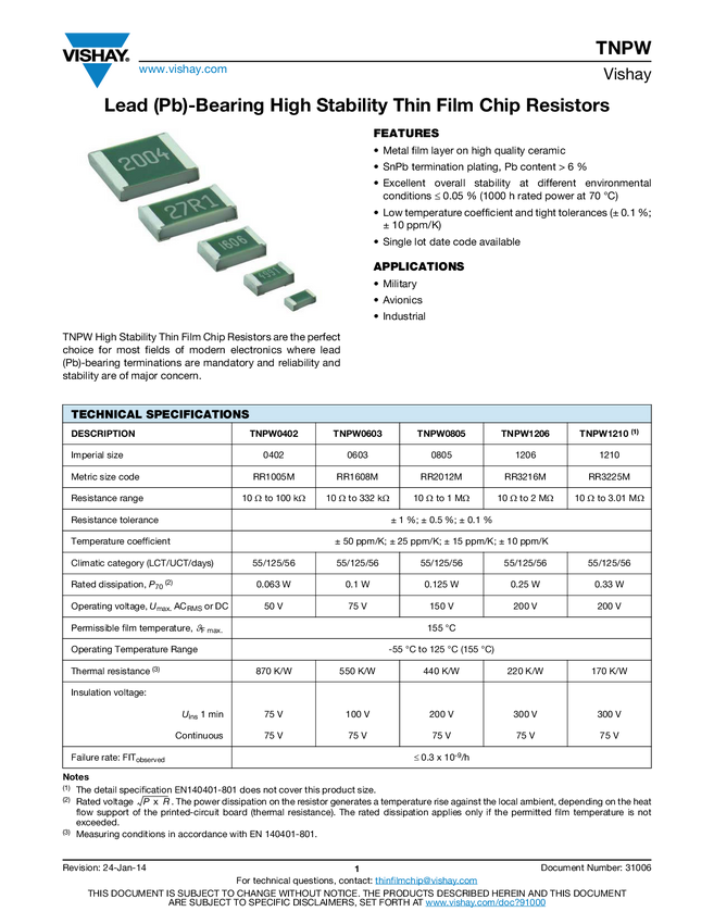 Lead (Pb)-Bearing High Stability Thin Film Chip Resistors