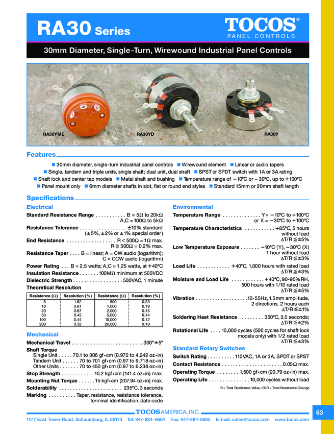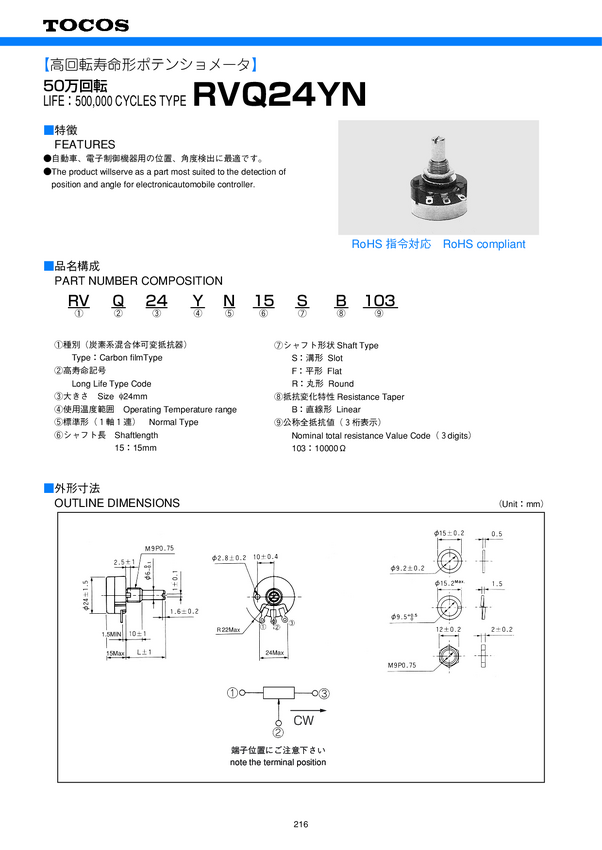 Potencjometr przewodzący plastik; bushing; Liniowość 10% moc.0,2W; 1 obrotowy z odczepem (CT); specjalny kąt el. 2x15 stopni; kąt mech. 360 st; śr.12,7mm; gł.10mm(+1,5); ośka 3mmx20mm; zamiennik dla modeli specjalnych RV12 Tocos i VP12 Tolerancja Rezystancji +-20% Patrz podobne modele w wykonaniu OEM SFCP12AC-CT-2x15-FL-10K SFCP12AC-CT-2x15-FL-10K-K