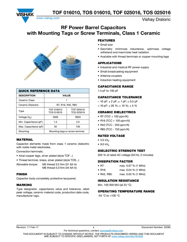 RF Power Barrel Capacitors with Mounting Tags or Screw Terminals, Class 1 Ceramic
