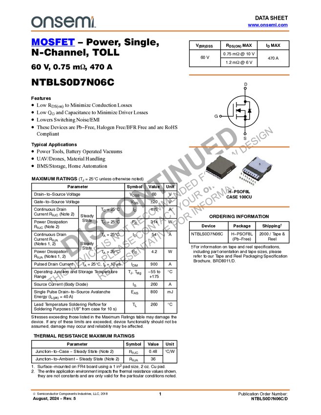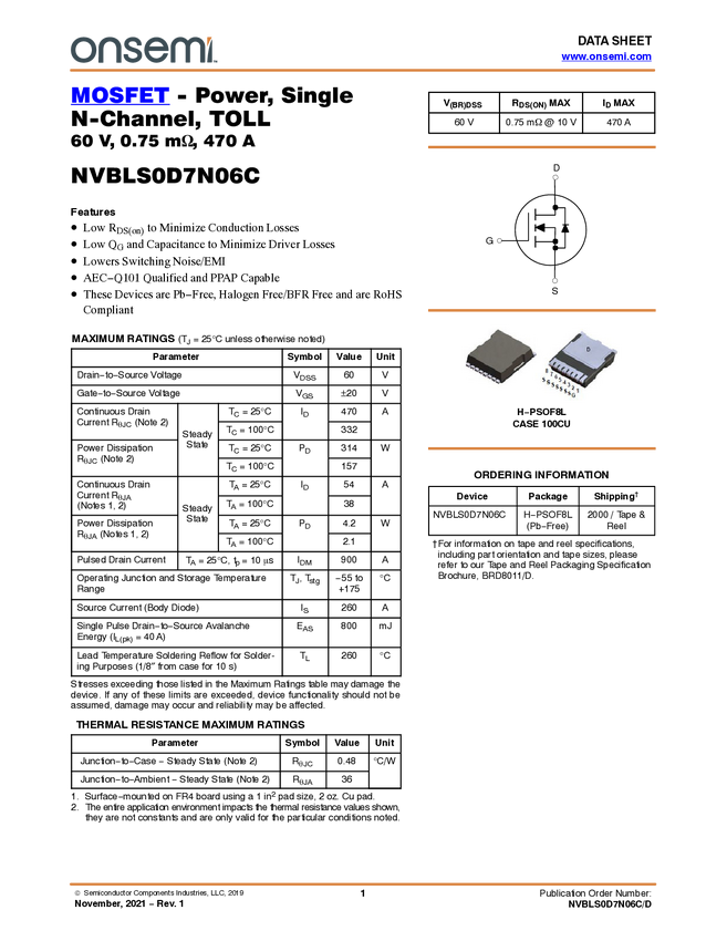 MOSFET - Power, Single, N-Channel, TOLL, 60 V, 0.75 mΩ, 470 A