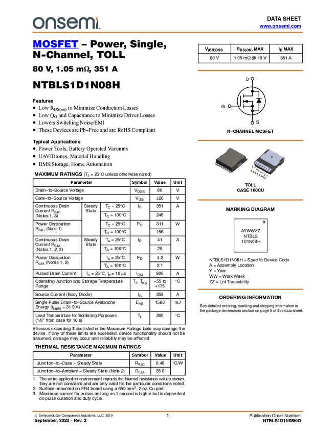 MOSFET - Power, Single, N-Channel, TOLL, 80 V, 1.05 mΩ, 351 A