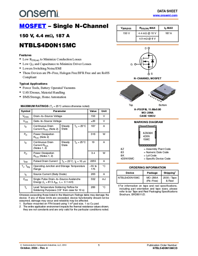 MOSFET - Power, Single, N-Channel, TOLL, 150 V, 4.4 mΩ, 187A