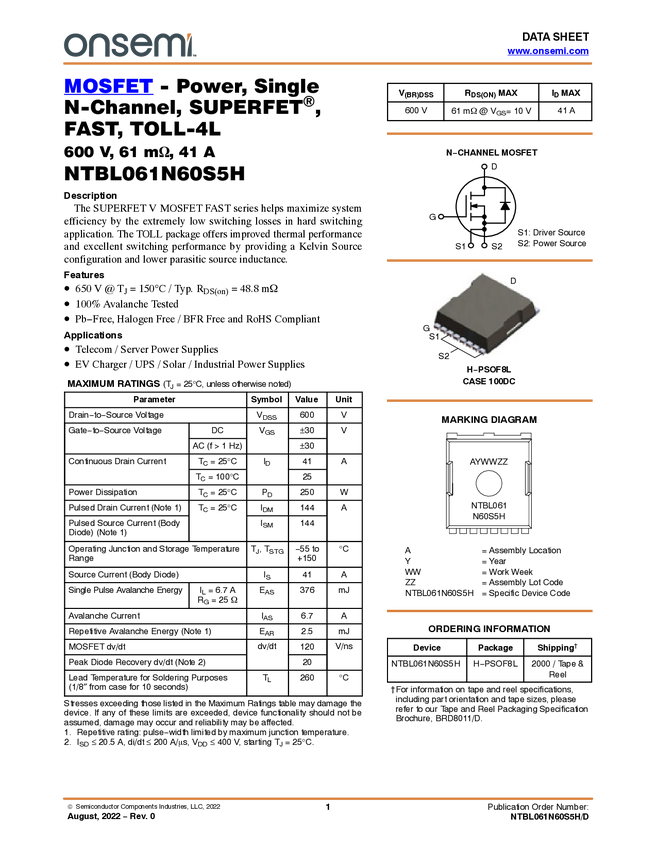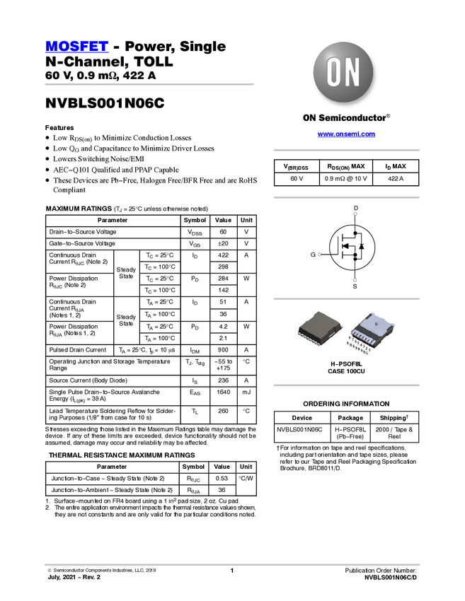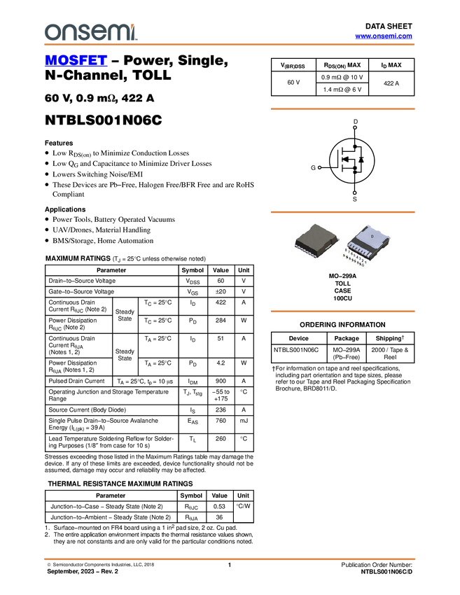 MOSFET - Power, Single, N-Channel, TOLL, 60 V, 0.9 mΩ, 422 A