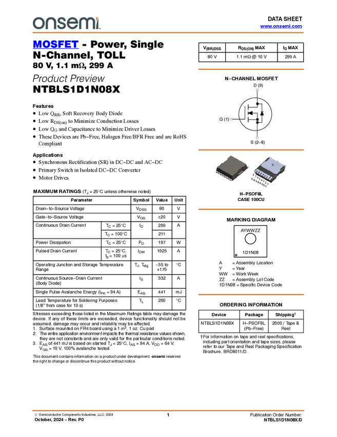 MOSFET - Power, Single, N-Channel, TOLL, 80 V, 1.1 mΩ, 299 A