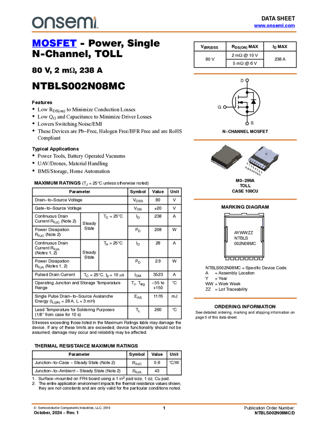 MOSFET - Power, Single, N-Channel, TOLL, 80 V, 2 mΩ, 238 A