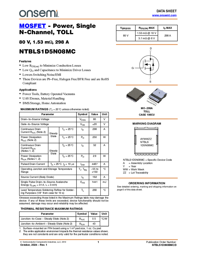 MOSFET - Power, Single, N-Channel, TOLL, 80 V, 1.53 mΩ, 298 A