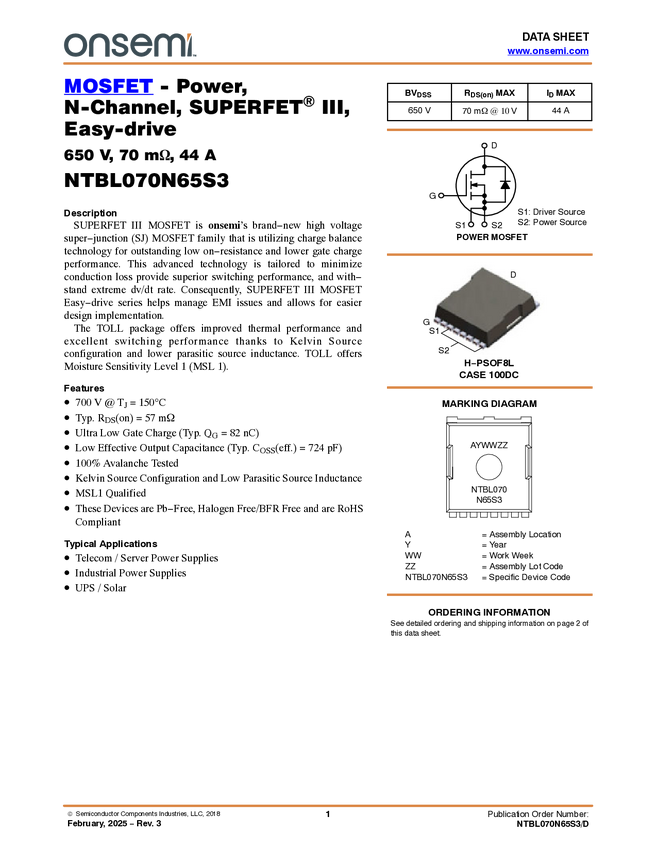Power MOSFET, N-Channel, SUPERFET® III, Easy Drive, 650 V, 44 A, 70 mΩ, TOLL