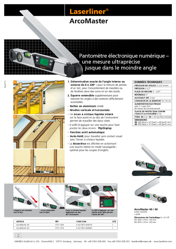 Kątomierz elektroniczny Laserliner ARCOMASTER 45 075.130A-45, Długość: 420 mm, Zakres pomiarowy: 0 - 220 °
