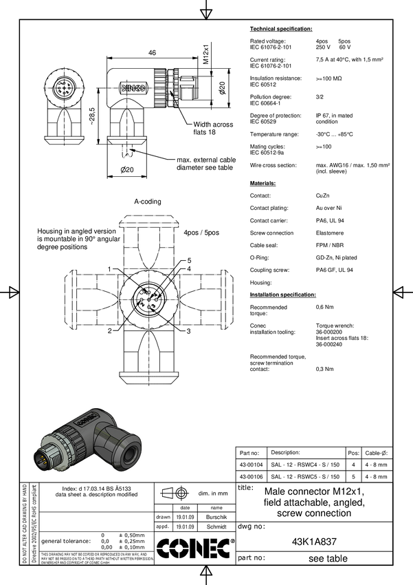 Wtyk; 43-00106; M12-5p; 5 torów; 0,25-1,5mm2; 4-8mm; IP67; 4A; 60V; CONEC; RoHS