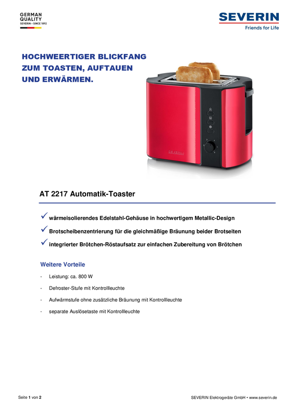 Severin AT 2217 Toster przewodowy, z podgrzewaczem do bułek czerwony (metaliczny), czarny