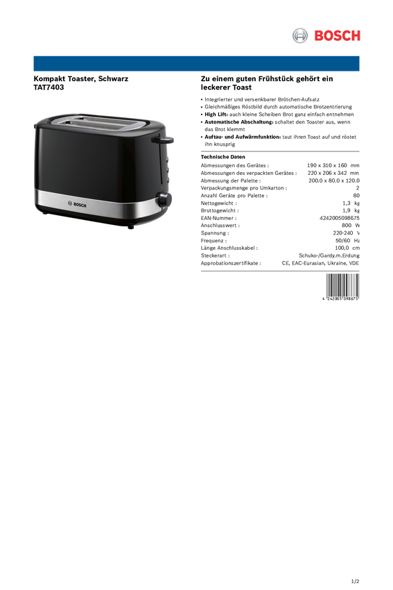 Toster Bosch Kompakt Styline, schwarz