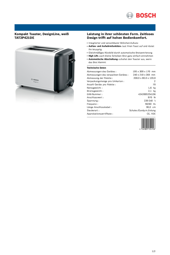 Toster z wbudowanym podgrzewaczem do bułek Bosch Haushalt TAT3P421DE