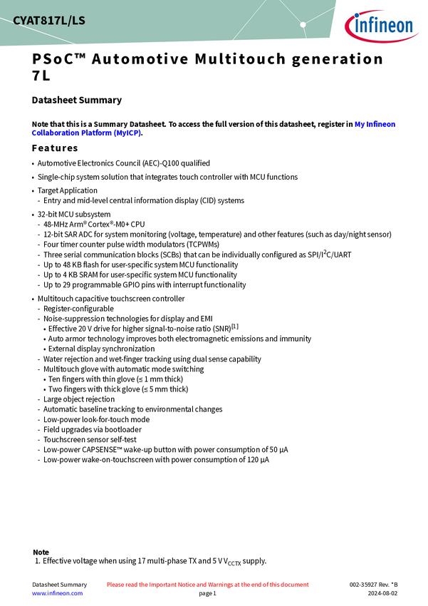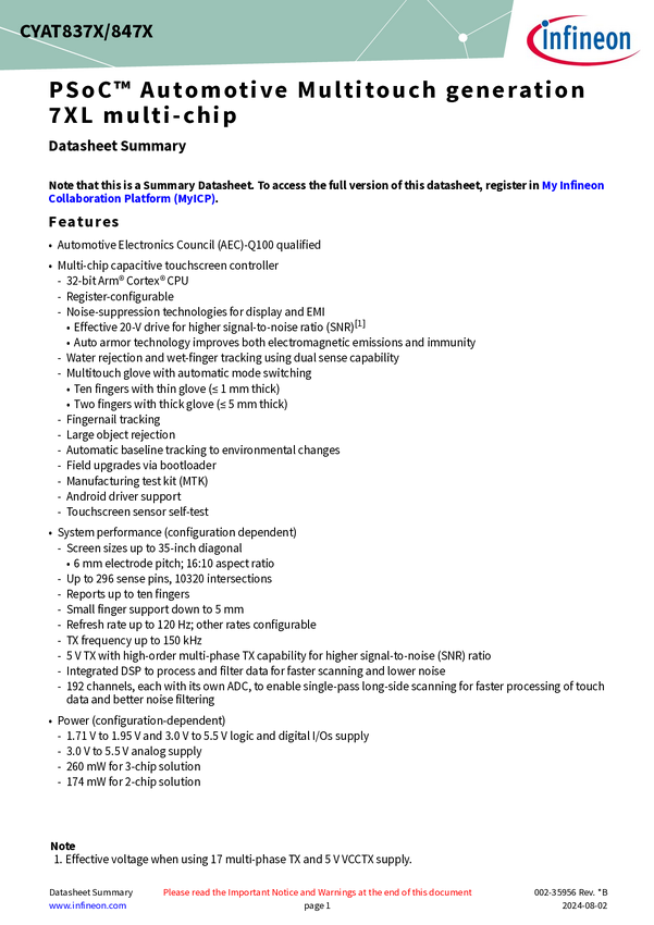 Automotive 1200V Silicon-carbide (SiC) Trench Power MOSFET in D2PAK-7L, 40mΩ CYAT817LS-128AS72 is an Electronics Council (AEC) Q100 qualified Multi-touch Capacitive touchscreen controller part of the PSOC™ Automotive Multitouch Gen7L. It comes in a PG-TQFP-128 package and supports screen sizes up to 11''. The touch controller provides a fast refresh rate up to 250Hz, supports water rejection, wet finger and thick gloves tracking. It incorporates Low power CAPSENSE™ wake-up button ith a consumption lower th