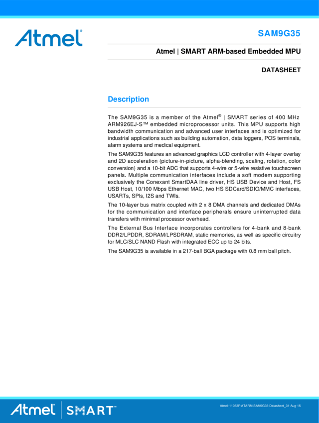 ARM926EJ Embedded Microprocessor Unit, 400MHz, LCD, Touchscreen, Ethernet, HS USB, LPDDR/DDR2/MLC NAND support, 217 Pins