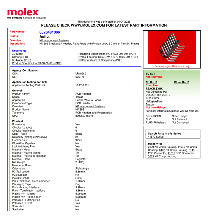 Molex Listwa kołkowa, męska, standardowa Ilość pinów 6 Wymiary siatki: 3.96 mm 26481066 1 szt. towar pakowany luzem