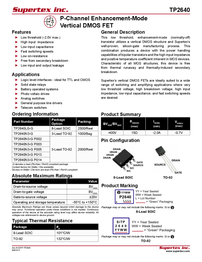 TP2640 Datasheet - P-Channel Enhancement-Mode Vertical DMOS FET (06/27/2014)