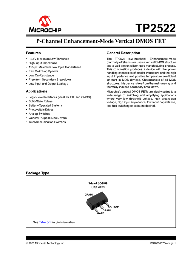 TP2522 P-Channel Enhancement-Mode Vertical DMOS FET Data Sheet