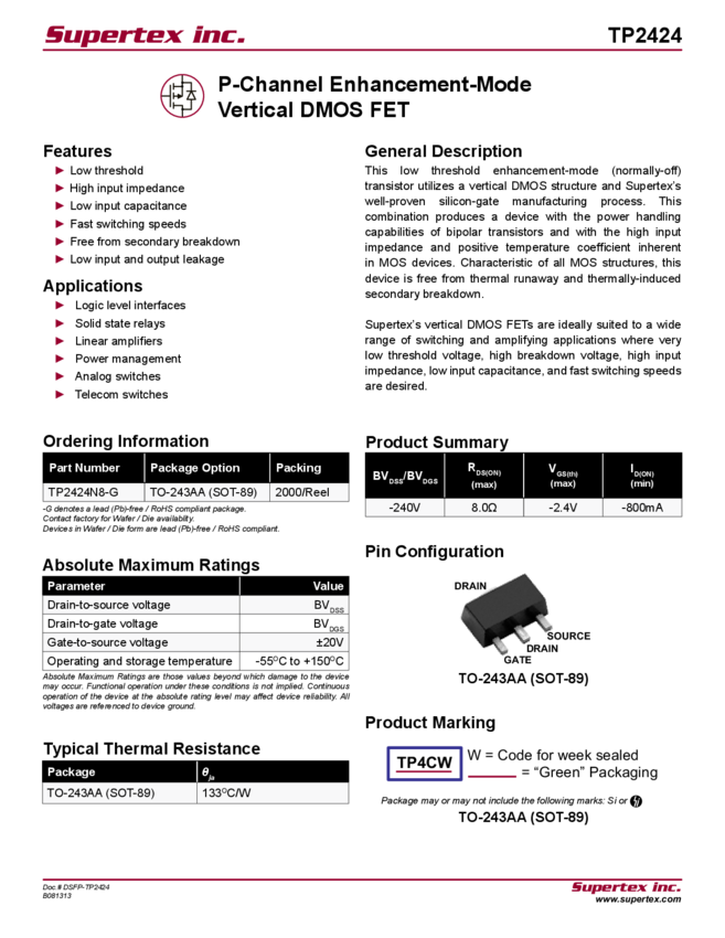 TP2424 Datasheet - P-Channel Enhancement-Mode Vertical DMOS FET (06/27/2014)