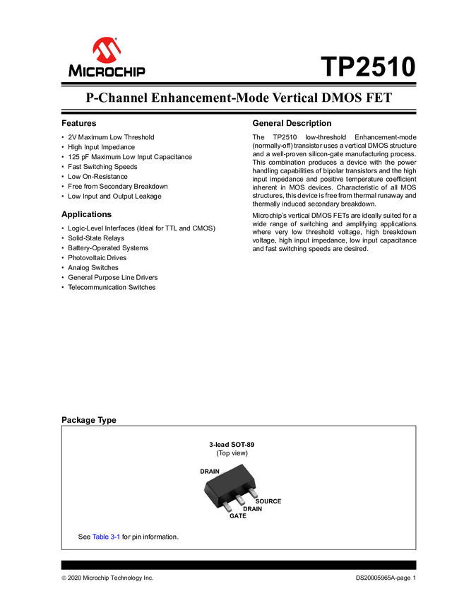 TP2502 P-Channel Enhancement-Mode Vertical DMOS FET Data Sheet